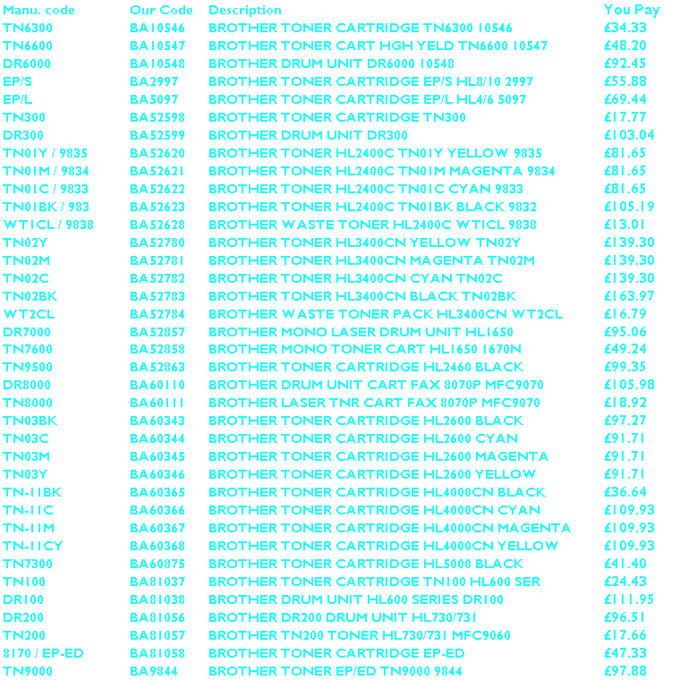 Buy Brother Toner. Original Genuine Brother Laser toner cartridge or Quality Compatible. We supply Toner from: Apple, Brother, BT, Canon, Epson, Genicom, HP, IBM, Konica, Kores, Kyocera, Lanier, Lexmark, Minolta, Mita, Muratec, NEC, OKI, Olivetti, Panasonic, Punchline, QMS, Ricoh, Sagem, Samsung, Sharp, Star, Tally, Tektronix, Toshiba, Xerox and many more. FREE delivery available. Buy from the best, not the rest ! Buytoner.co.uk fax, copier & printer |
