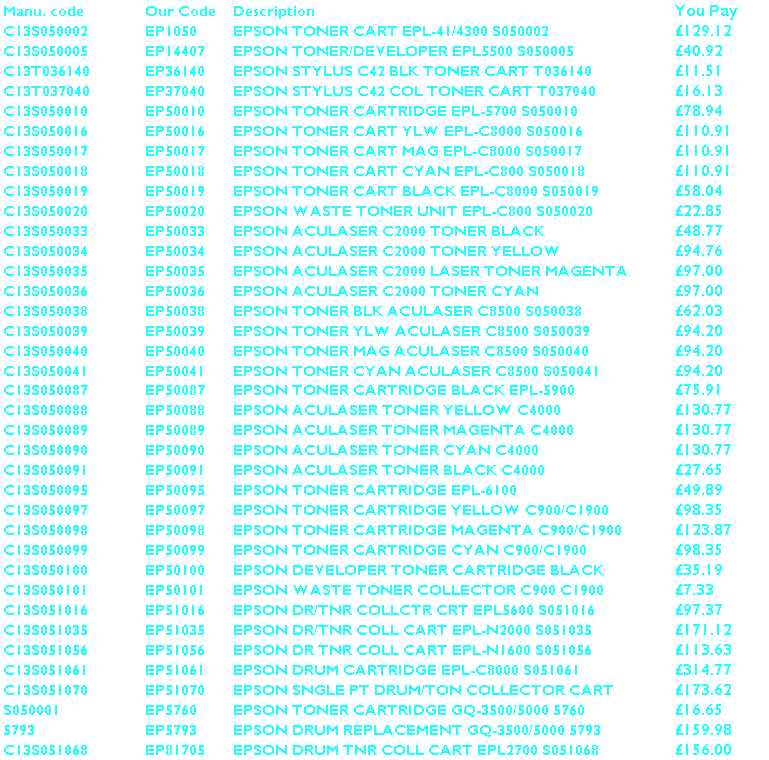 Buy Epson Toner. Original Genuine Epson Laser toner cartridge or Quality Compatible. We supply Toner from: Apple, Brother, BT, Canon, Epson, Genicom, HP, IBM, Konica, Kores, Kyocera, Lanier, Lexmark, Minolta, Mita, Muratec, NEC, OKI, Olivetti, Panasonic, Punchline, QMS, Ricoh, Sagem, Samsung, Sharp, Star, Tally, Tektronix, Toshiba, Xerox and many more. FREE delivery available. Buy from the best, not the rest ! Buytoner.co.uk fax, copier & printer |
