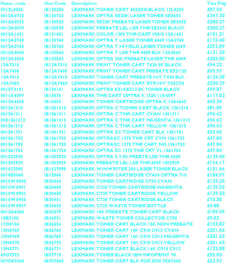 Buy Lexmark Toner. Original Genuine Lexmark Laser toner cartridge or Quality Compatible. We supply Toner from: Apple, Brother, BT, Canon, Epson, Genicom, HP, IBM, Konica, Kores, Kyocera, Lanier, Lexmark, Minolta, Mita, Muratec, NEC, OKI, Olivetti, Panasonic, Punchline, QMS, Ricoh, Sagem, Samsung, Sharp, Star, Tally, Tektronix, Toshiba, Xerox and many more. FREE delivery available. Buy from the best, not the rest ! Buytoner.co.uk fax, copier & printer |