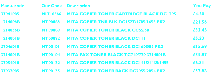 Buy Mita Toner. Original Genuine Mita Laser toner cartridge or Quality Compatible. We supply Toner from: Apple, Brother, BT, Canon, Epson, Genicom, HP, IBM, Konica, Kores, Kyocera, Lanier, Lexmark, Minolta, Mita, Muratec, NEC, OKI, Olivetti, Panasonic, Punchline, QMS, Ricoh, Sagem, Samsung, Sharp, Star, Tally, Tektronix, Toshiba, Xerox and many more. FREE delivery available. Buy from the best, not the rest ! Buytoner.co.uk fax, copier & printer |