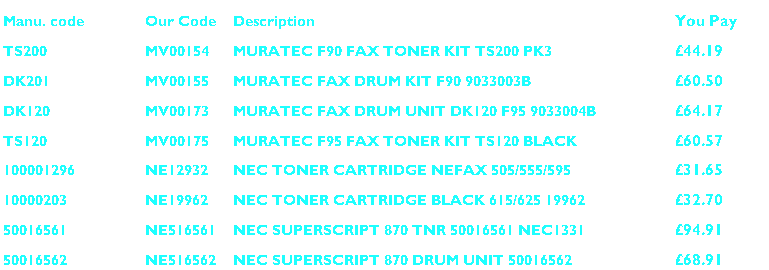 Buy Muratec NEC or Olivetti Toner. Original Genuine Muratec NEC or Olivetti Laser toner cartridge or Quality Compatible. We supply Toner from: Apple, Brother, BT, Canon, Epson, Genicom, HP, IBM, Konica, Kores, Kyocera, Lanier, Lexmark, Minolta, Mita, Muratec, NEC, OKI, Olivetti, Panasonic, Punchline, QMS, Ricoh, Sagem, Samsung, Sharp, Star, Tally, Tektronix, Toshiba, Xerox and many more. FREE delivery available. Buy from the best, not the rest ! Buytoner.co.uk fax, copier & printer |