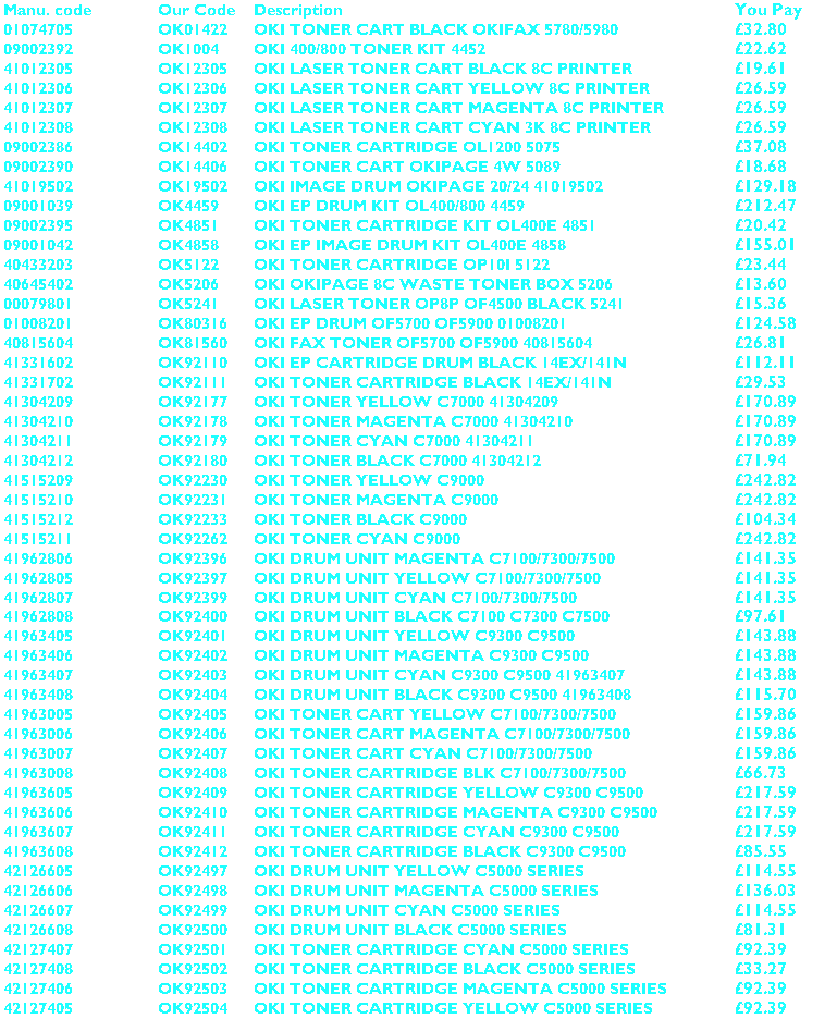 Buy Oki Toner. Original Genuine Oki Laser toner cartridge or Quality Compatible. We supply Toner from: Apple, Brother, BT, Canon, Epson, Genicom, HP, IBM, Konica, Kores, Kyocera, Lanier, Lexmark, Minolta, Mita, Muratec, NEC, OKI, Olivetti, Panasonic, Punchline, QMS, Ricoh, Sagem, Samsung, Sharp, Star, Tally, Tektronix, Toshiba, Xerox and many more. FREE delivery available. Buy from the best, not the rest ! Buytoner.co.uk fax, copier & printer |