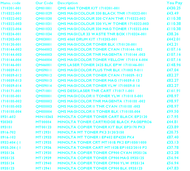 Buy Minolta QMS Toner. Original Genuine Minolta QMS Laser toner cartridge or Quality Compatible. We supply Toner from: Apple, Brother, BT, Canon, Epson, Genicom, HP, IBM, Konica, Kores, Kyocera, Lanier, Lexmark, Minolta, Mita, Muratec, NEC, OKI, Olivetti, Panasonic, Punchline, QMS, Ricoh, Sagem, Samsung, Sharp, Star, Tally, Tektronix, Toshiba, Xerox and many more. FREE delivery available. Buy from the best, not the rest ! Buytoner.co.uk fax, copier & printer |