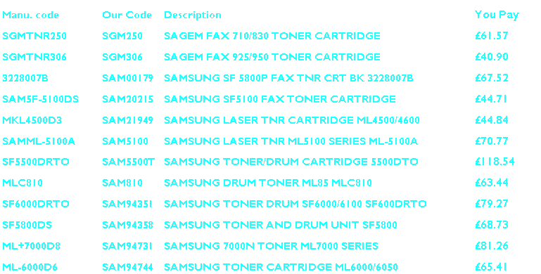 Buy Sagem or Samsung Toner. Original Genuine Sagem or Samsung Laser toner cartridge or Quality Compatible. We supply Toner from: Apple, Brother, BT, Canon, Epson, Genicom, HP, IBM, Konica, Kores, Kyocera, Lanier, Lexmark, Minolta, Mita, Muratec, NEC, OKI, Olivetti, Panasonic, Punchline, QMS, Ricoh, Sagem, Samsung, Sharp, Star, Tally, Tektronix, Toshiba, Xerox and many more. FREE delivery available. Buy from the best, not the rest ! Buytoner.co.uk fax, copier & printer |