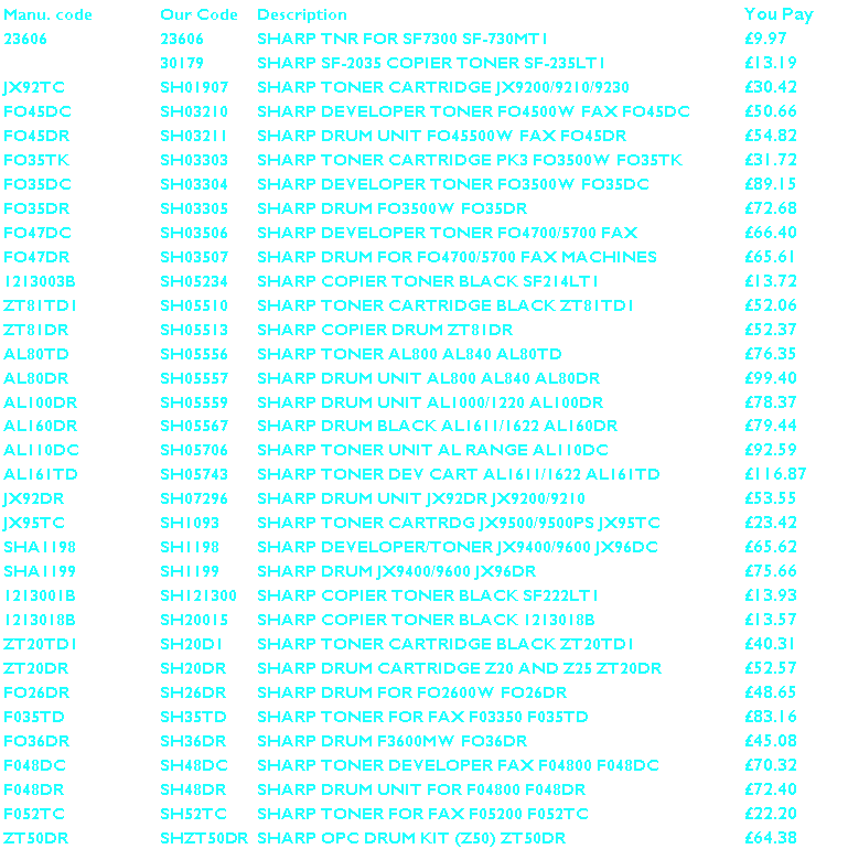 Buy Sharp Toner. Original Genuine Sharp Laser toner cartridge or Quality Compatible. We supply Toner from: Apple, Brother, BT, Canon, Epson, Genicom, HP, IBM, Konica, Kores, Kyocera, Lanier, Lexmark, Minolta, Mita, Muratec, NEC, OKI, Olivetti, Panasonic, Punchline, QMS, Ricoh, Sagem, Samsung, Sharp, Star, Tally, Tektronix, Toshiba, Xerox and many more. FREE delivery available. Buy from the best, not the rest ! Buytoner.co.uk fax, copier & printer |